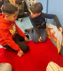 De Nationale Voorleesdagen zijn van 21 januari t/m 1 februari. Tijdens De Nationale Voorleesdagen staat alles in het teken van (voor)leesplezier. Voorlezen heeft namelijk heel wat voordelen, zoals een positief effect op de woordenschat en het tekstbegrip. Bovendien ontwikkelen kinderen naast hun taalgevoel ook een beter inlevingsvermogen. Omdat (voor)lezen dus zo belangrijk is proberen wij dat zo veel mogelijk te doen op school. Daarom hebben de kinderen van SO Groen geoefend met het voorlezen van een boek en hebben we vandaag de kinderen van SO Oranje voorgelezen.
